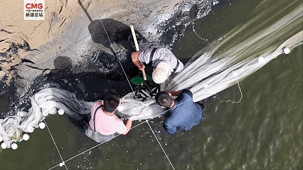 在且末县水产养殖基地,工人们正在捕捞鲻鱼、沙锥等海产品。当地通过水碱减碱技术成功实现沙漠海鲜养殖,规模达500多公顷,成活率达96%。